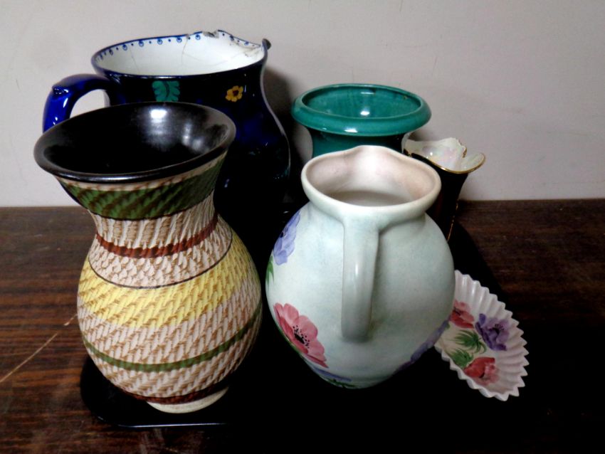 A tray containing antique and later ceramics to include a Maling oversized jug, pattern no. 3295, West German vase, Carltonware Rouge Royale vase etc