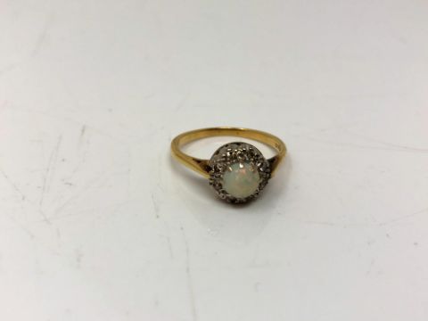 An 18ct gold and platinum opal and diamond cluster ring, size O.