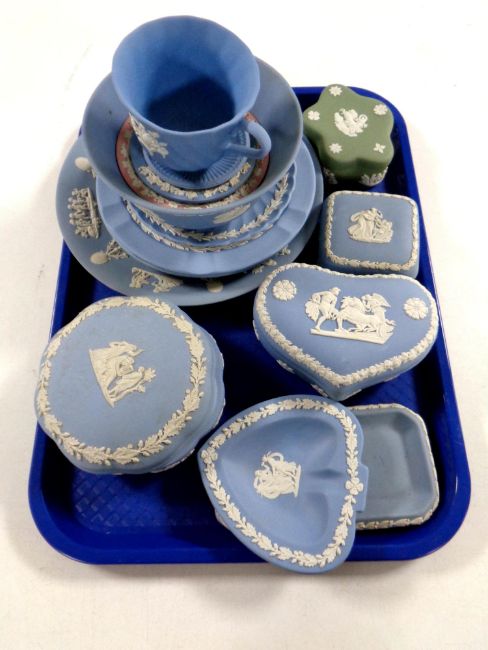 A tray containing 15 pieces of Wedgwood Jasperware to include teacup and saucer, dishes, lidded trinket pots etc