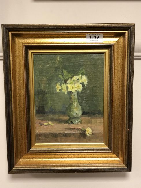 Phoebe Tulloh : Still life with yellow flowers in a green vase, oil on board, signed, 21 x 16 cm, framed