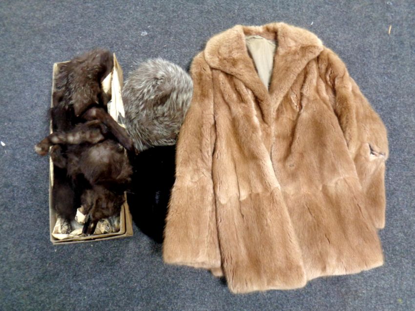 A box containing fur coat (as found), a fox fur wrap, hats etc