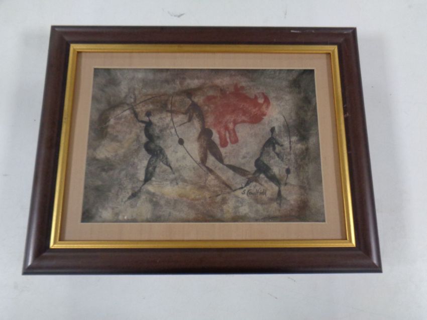 An S Caulfield tribal painting depicting native figures and a rhinoceros on hide in display frame