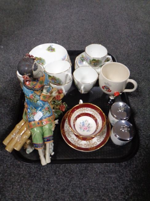 A tray containing assorted ceramics to include Royal Worcester egg coddlers, six diamond china trios, Carltonware commemorative mug, pottery figure of a geisha