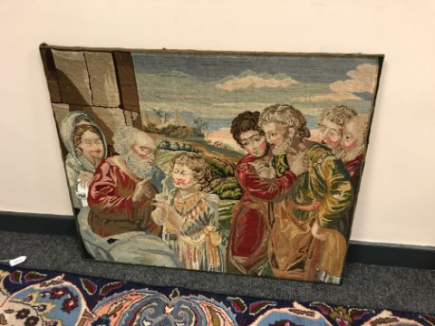 A nineteenth century tapestry depicting figures with a child, 81 cm x 56 cm.