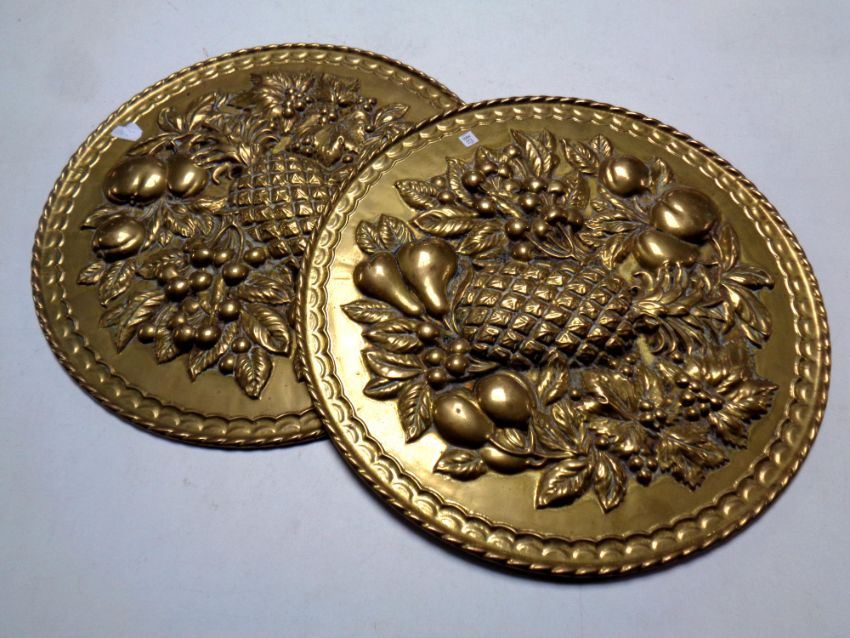 A pair of brass embossed plaques with fruit decoration