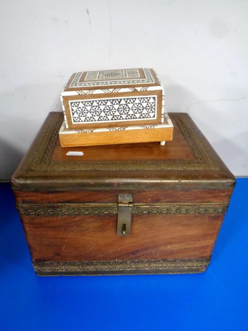 An eastern mahogany brass bound table box together with a tourist cigarette box