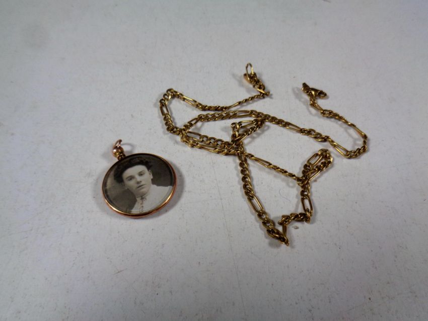 A 9ct gold chain together with a 9ct gold twin sided pendant bearing monochrome photographs