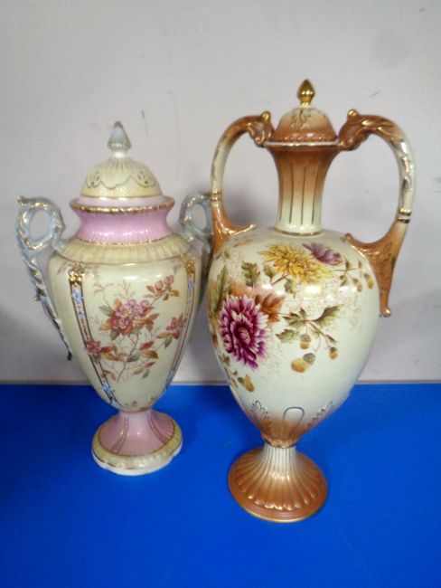 Two antique porcelain transfer printed twin handled lidded vases