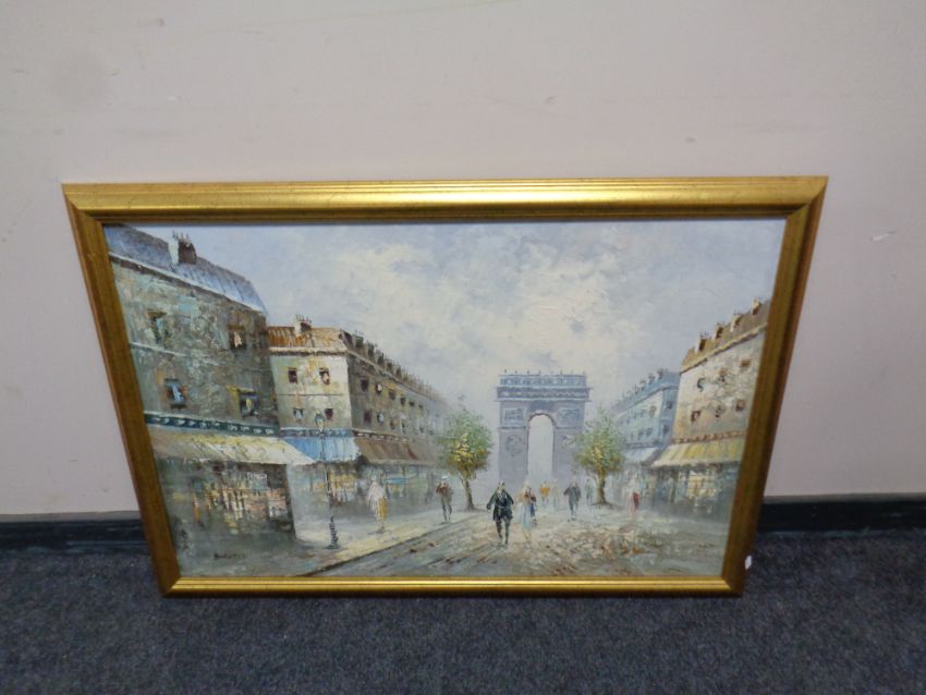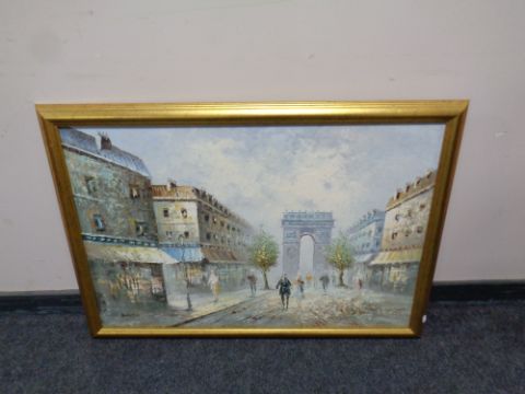 A Burnett oil on canvas, Parisian street scene, in gilt frame