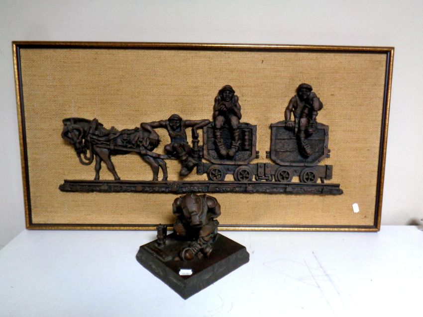 A Robert Olley relief plaque depicting a horse drawn mining cart with three miners, together with a further Robert Olley sculpture of a miner (as found)