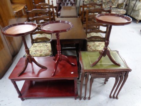 A nest of three glass and leather topped tables together with a two tier coffee tale and three wine tables