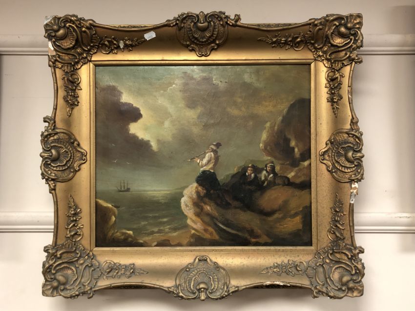 Nineteenth century school : The look out, figures on a rock, oil on canvas, 47 cm x 40 cm, framed.