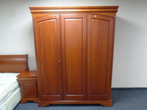 An Olympus Furniture cherry wood triple door wardrobe, 158cm wide by 65cm deep by 199cm high.