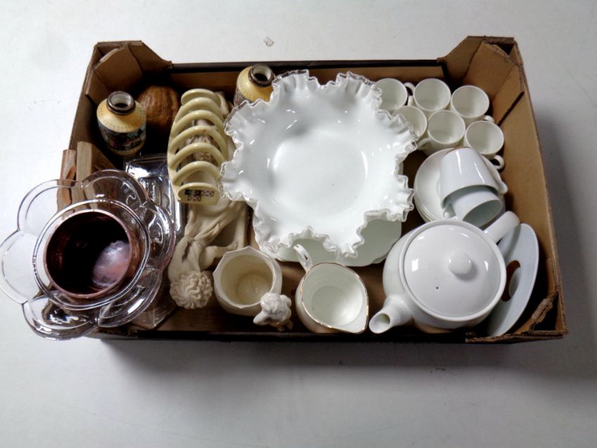 A box containing miscellaneous ceramics and glassware to include handkerchief dish, Wedgwood coffee cans and saucers, toast rack, glass comport
