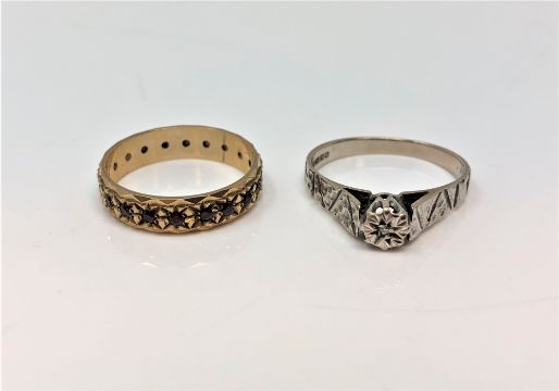 An 18ct white gold diamond set ring, together with a 9ct yellow gold band ring set with garnets. 3.2g & 2.5g. (2)