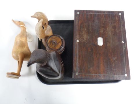 A tray containing wooden items to include a 19th century rosewood jewellery box, a Jerusalem walnut lidded caddy, together with three wooden animal figures
