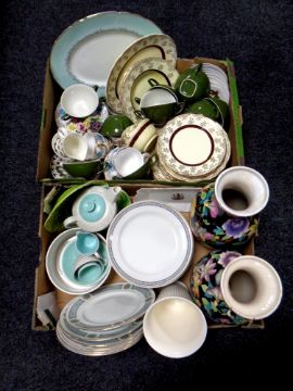 Two boxes containing a large quantity of miscellaneous ceramics and glassware to include Royal Doulton group dinner plates, Wedgwood vase, part tea services, Poole teaware, floral patterned vases etc