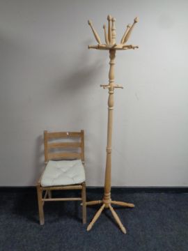 A stripped pine hat and coat stand together with a pine ladder back rush seated kitchen chair