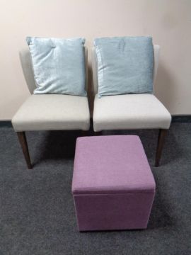 A pair of contemporary bedroom chairs with cushions together with a foot cube
