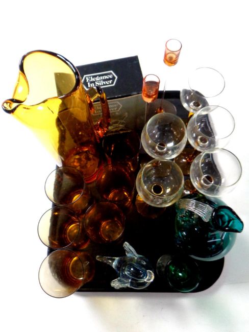 A tray of 20th century glass ware to include amber glass water jug and beakers, green glass liqueur decanter, two tone wine glasses etc.