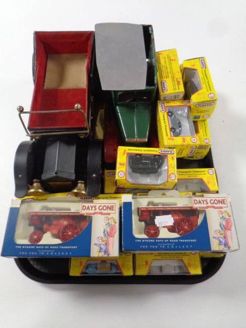 A tray containing two 20th century tin plate vehicles together with two further Lledo Days Gone attraction engines, boxed, and 19 Classix 1:76 scale Transport Treasures die cast vehicles
