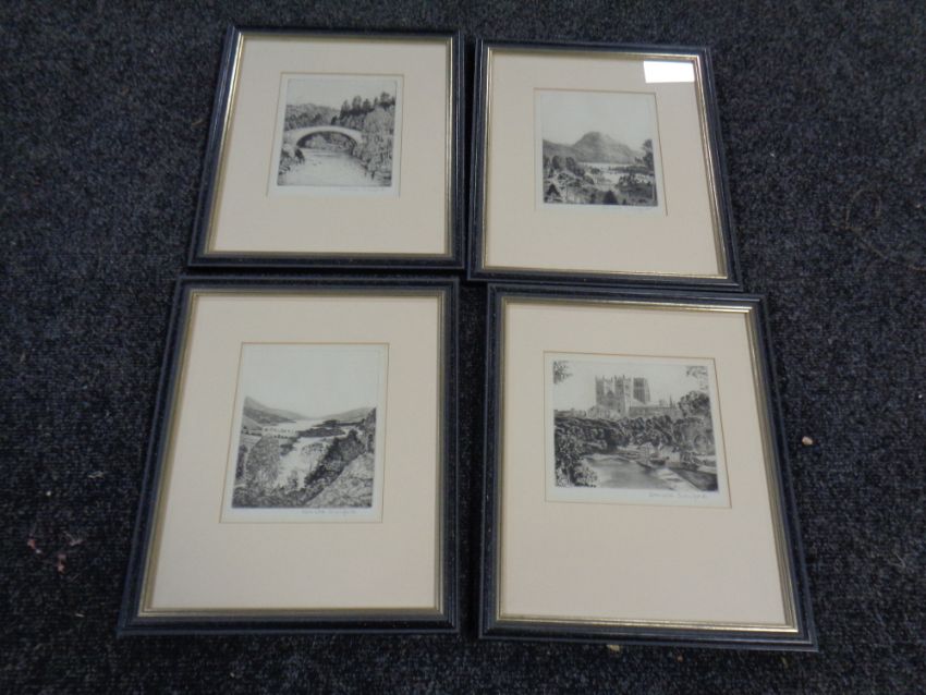 Four signed Donald Crawford black and white etchings to include Durham Cathedral