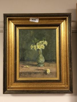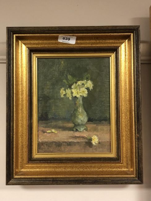 Phoebe Tulloh : Still life with yellow flowers in a green vase, oil on board, signed, 21 x 16 cm, framed