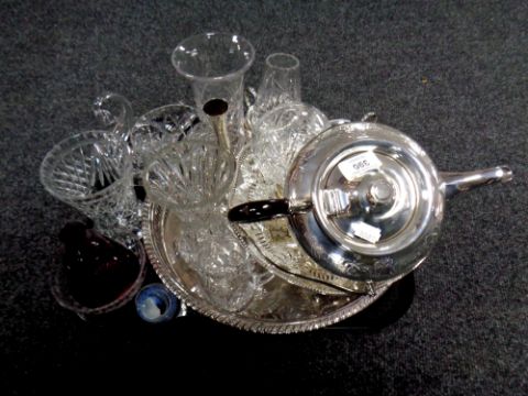 A tray containing a large quantity of silver plated and glass items to include lead crystal cut glass vases, paperweights, plated tea service on tray etc