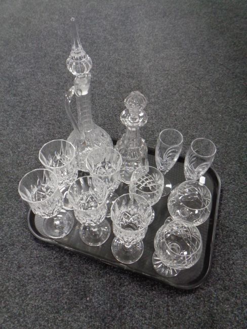 A tray of lead crystal glass ware : wine and champagne glasses, two decanters