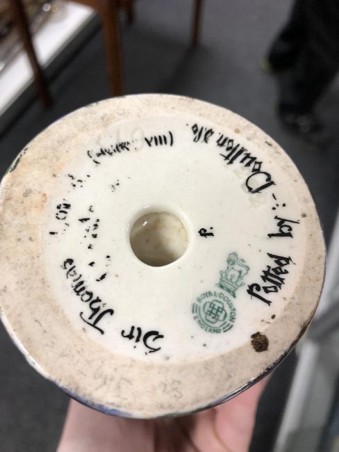 This figure appears to be a colour variant of HN356, with colours of blue, purple & brown. The figure shows no signs of damage, flakes chips, restoration or oxidisation. The base is inscribed in black as expected 'Potted by Doulton', the black paint in this area is rubbed and not all decipherable.