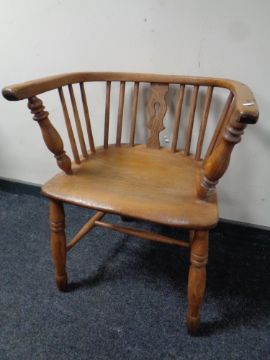 An antique elm kitchen armchair (no back)