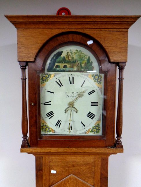 A 19th century oak cased longcase clock with painted dial by Bell of Hexham, together with pendulum and weight