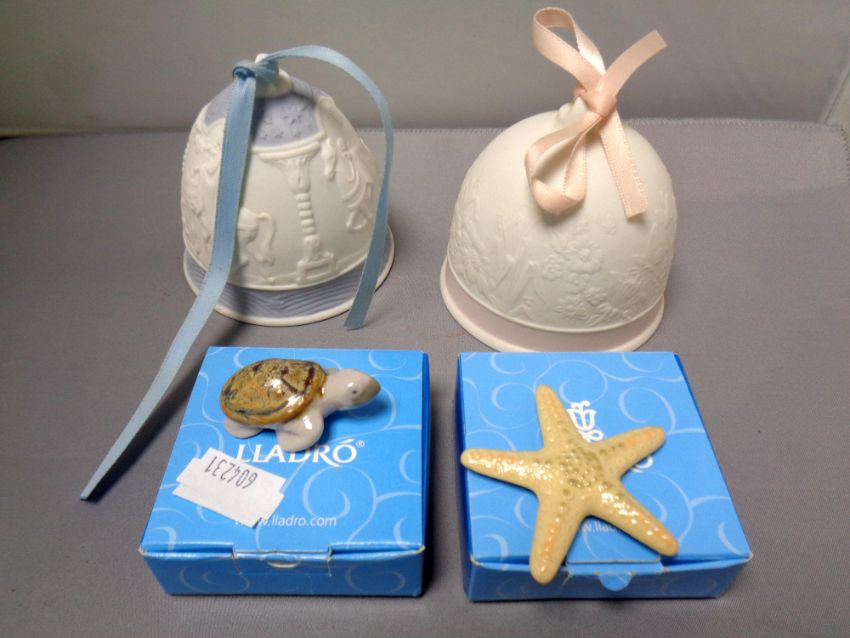 Two Lladro bells and a two further Lladro figures - starfish and turtle (boxed)