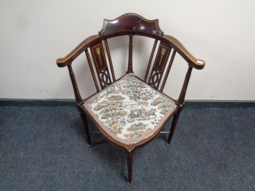 An Edwardian beech corner chair with a tapestry upholstered seat