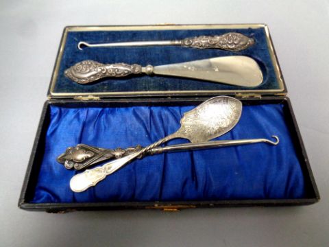 A cased silver handled button hook and shoe horn, Chester marks, 1913, together with a silver handled button hook and a Sheffield silver spoon