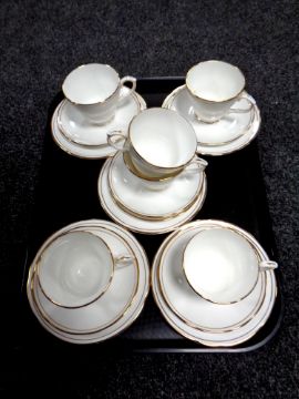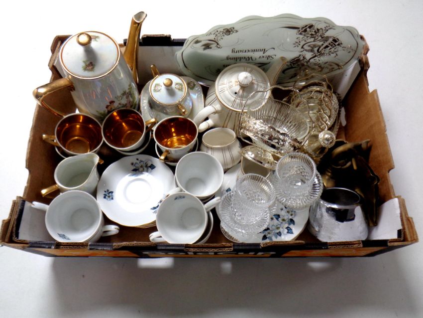 Six Duchess Ascot bone china trios and a box of Czechoslovakian tea ware, Golden Wedding tea service, brass ware etc