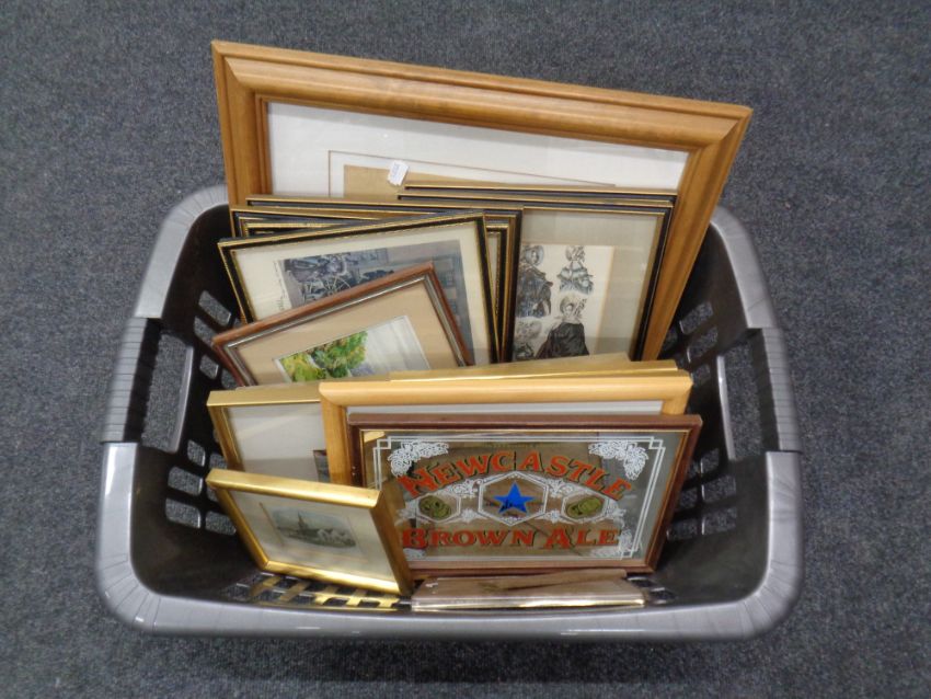 A basket containing assorted framed pictures an prints to include colour etchings, coaching scenes, a Newcastle Brown Ale picture mirror, black and gilt framed colour prints, figures in Victorian dress