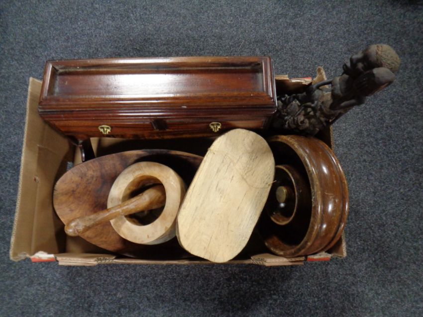 A box containing wooden items to include wall mounted valet stand, carved tribal figure and mask, wooden pestle and mortar etc