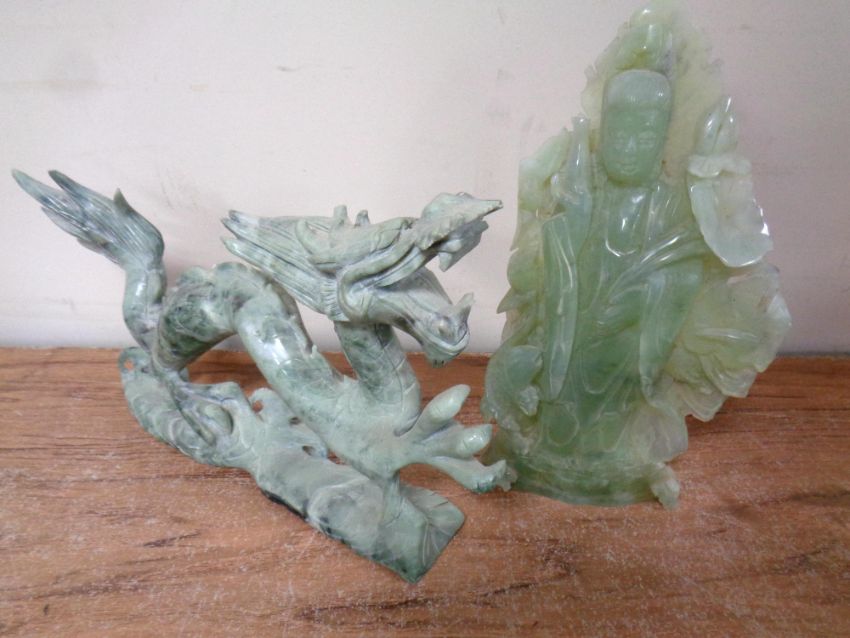 Two carved jade-type figures, dragon and eastern deity