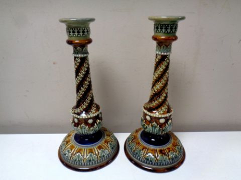 A near pair of Royal Doulton candlesticks, height 29.8 and 29.2 cm (as found)