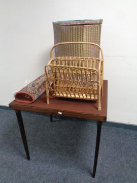 A folding baize topped card table together with a bamboo and wicker magazine rack, and a glass topped loom linen box