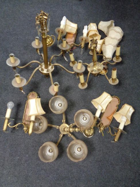 A plastic water tank containing a large quantity of assorted brass chandeliers and wall lights