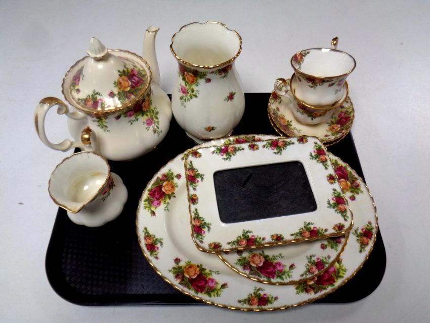 A tray containing ten pieces of Royal Albert Old Country Roses china to include a six piece tea for two