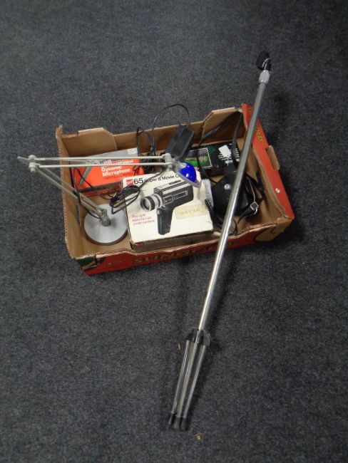 A box containing a microphone stand together with two boxed microphones, cameras, a GAF Super 8 movie camera, together with a contemporary angle poise lamp