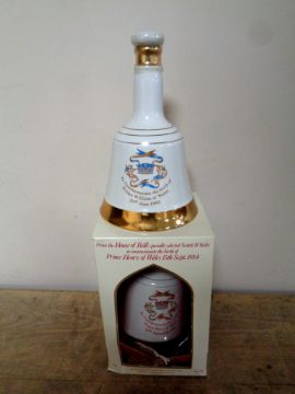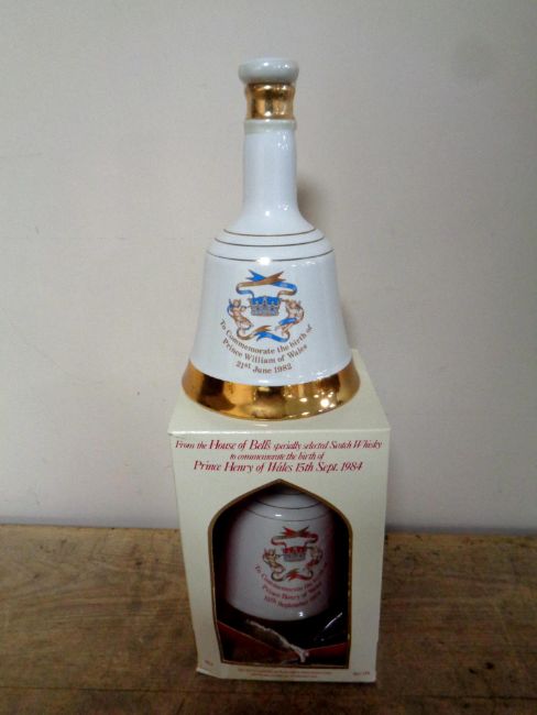 A Bell's Scotch Whisky decanter by Wade to commemorate The Birth of Prince Henry of Wales 1984, 50cl, sealed in presentation box, together with a further decanter, The Birth of Prince William of Wales 1982, 50cl, sealed (no box)