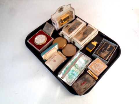A tray containing a collection of lady's compacts, cigarette case containing Maltese note, Ringtons die cast cars etc