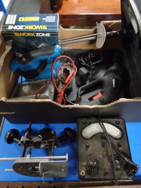 A Powercraft router table together with a box containing power tools, Bakelite cased avometer, two sash clamps, together with a boxed Workzone shelving unit