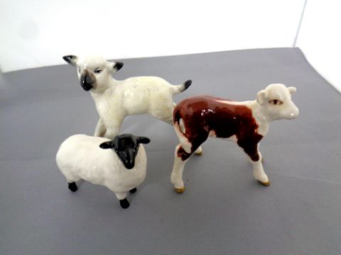 Three Beswick figures, black faced lamb No. 1828, lamb No. 936 and Hereford calf No. 1406B