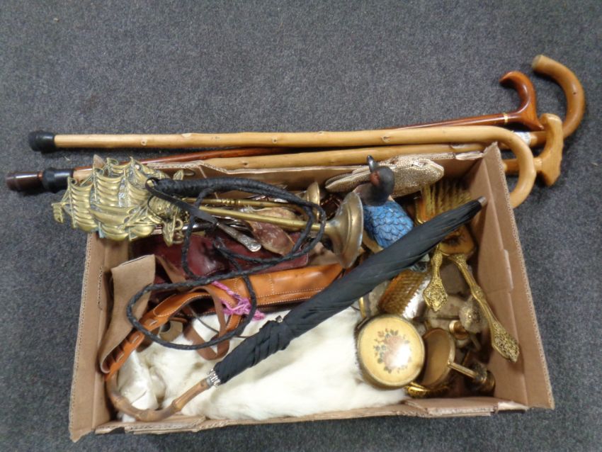 A box of miscellany to include leather holsters, walking stick, brass ware, dressing table set, mink fur coat