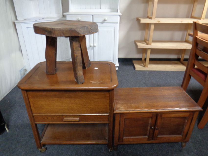 A 20th century sewing trolley together with an oak double door low cupboard and a rustic stool